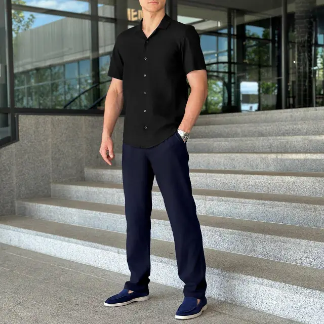 Повсякденний чоловічий костюм може бути менш формальним, оскільки допускаються м’які тканини, світлі кольори та навіть поєднання з кросівками, якщо стиль дозволяє.
